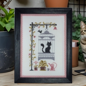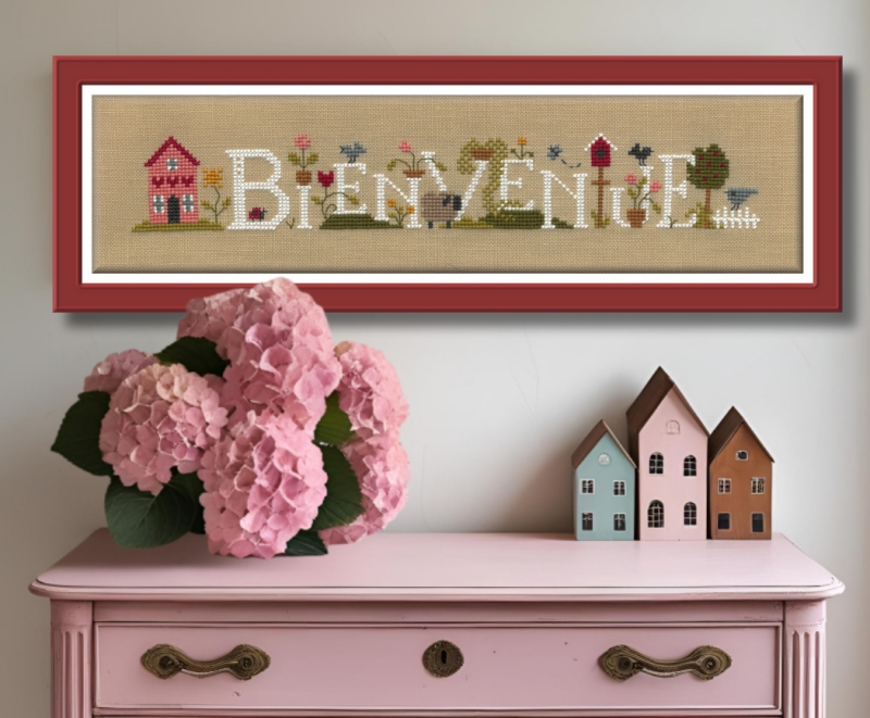 Un accueil chaleureux en quelques points. Ce modèle joue avec les grandes lettres du mot « Bienvenue », habitées de petits détails qui donnent vie à la scène : une maison rose, des fleurs colorées, des oiseaux et même un nichoir. Facile à broder, il se prête bien à une finition en bannière ou en cadre près de la porte d’entrée. Un projet accessible, gai et décoratif, parfait pour offrir ou pour personnaliser son intérieur.