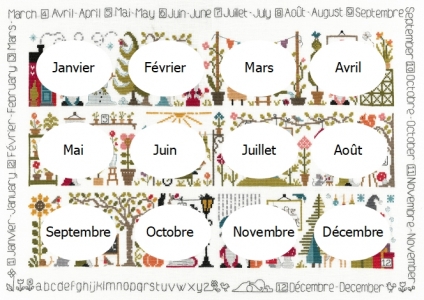 Au lieu d'indiquer les mois sur chaque partie, j'ai choisi de glisser dans chaque petite scène une petite pancarte avec le numéro du mois, et de former une bordure qui indique les mois en français et en anglais. D'autres langues seront disponibles dans les prochains jours en fonction des demandes.