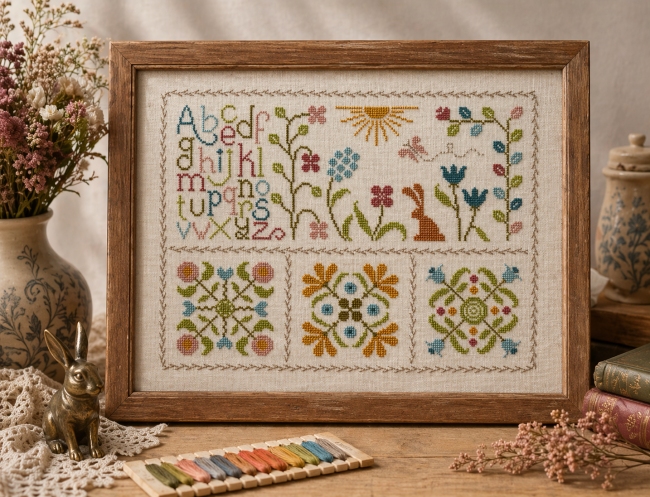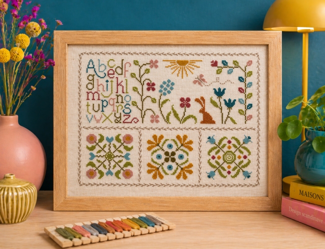 La broderie présentée a été réalisée sur une toile de lin Belfast 12,6 fils de Zweigart coloris Crème clair réf. 3609/99 en brodant avec 2 brins sur 2 fils de toile.