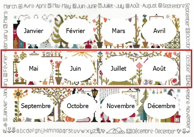 Cette seconde partie est ma préférée et elle peut se broder seule, indépendamment des deux autres car elle ne contient aucune connotation liée à la météo ou aux fêtes. Pour les petites pancartes avec les nombres des mois, on peut facilement mettre une petite fleur ou autres à la place du chiffre.