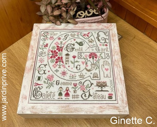 La broderie présentée a été réalisée sur une toile de lin Newcastle 16 fils de Zweigart coloris Blanc cassé réf. 3348/101 en brodant avec 1 brin sur 2 fils de toile.