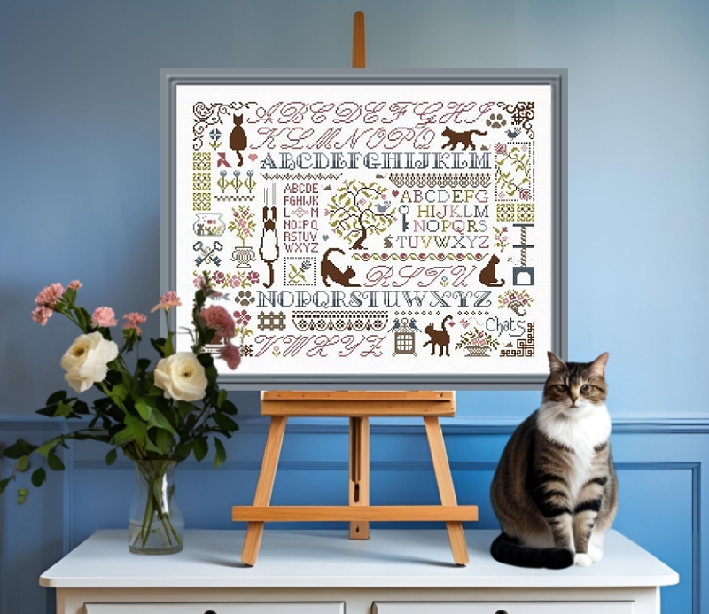 Quand j'ai colorisé le Sampleur aux Fleurs, j'ai reçu beaucoup de demandes de brodeuses pour que le Sampler aux Chats soit lui aussi colorisé, ce qui est fait désormais, mais il peut continuer à être brodé en monochrome, il suffit juste de lire la grille sans tenir compte du code couleurs.